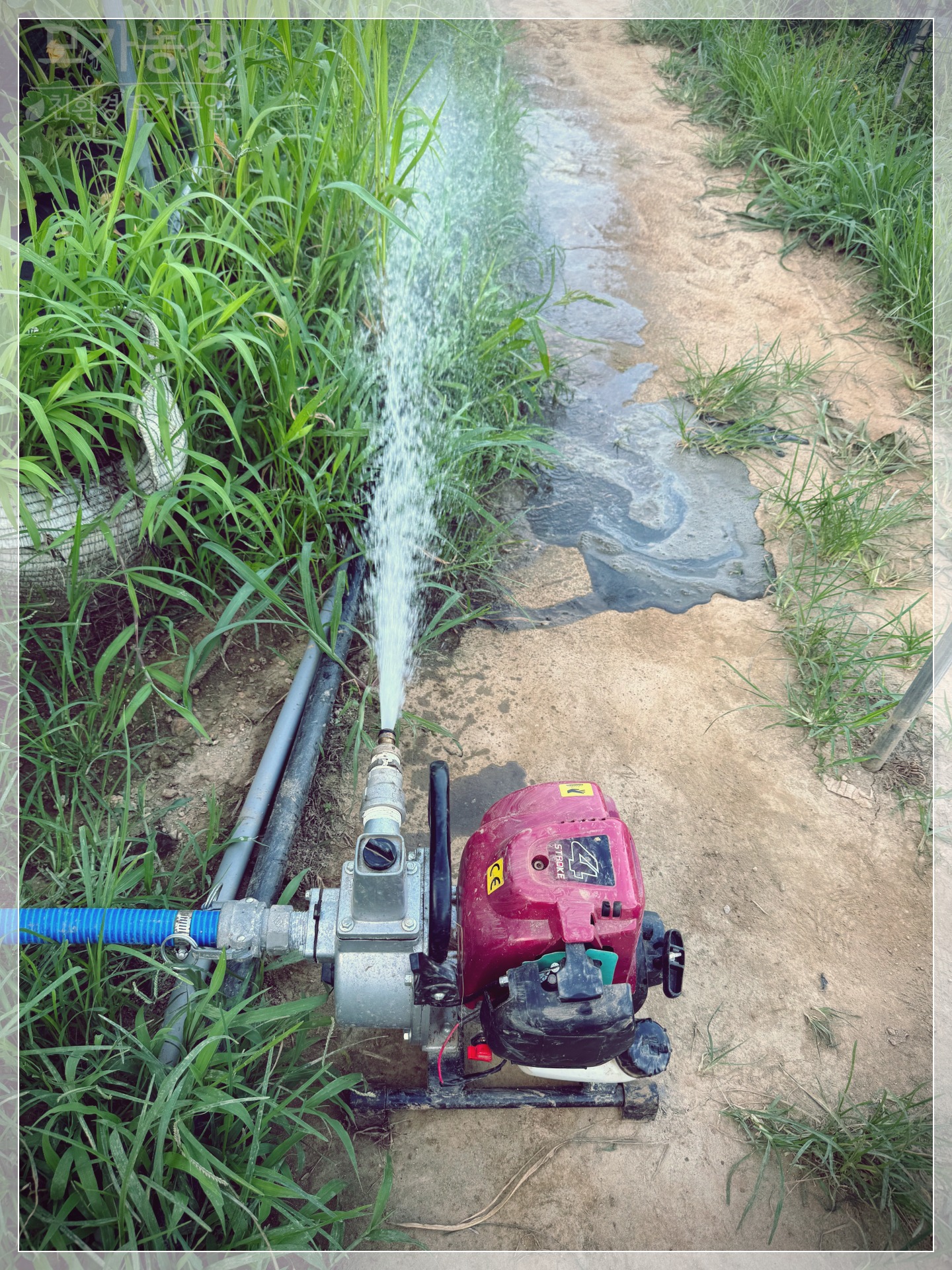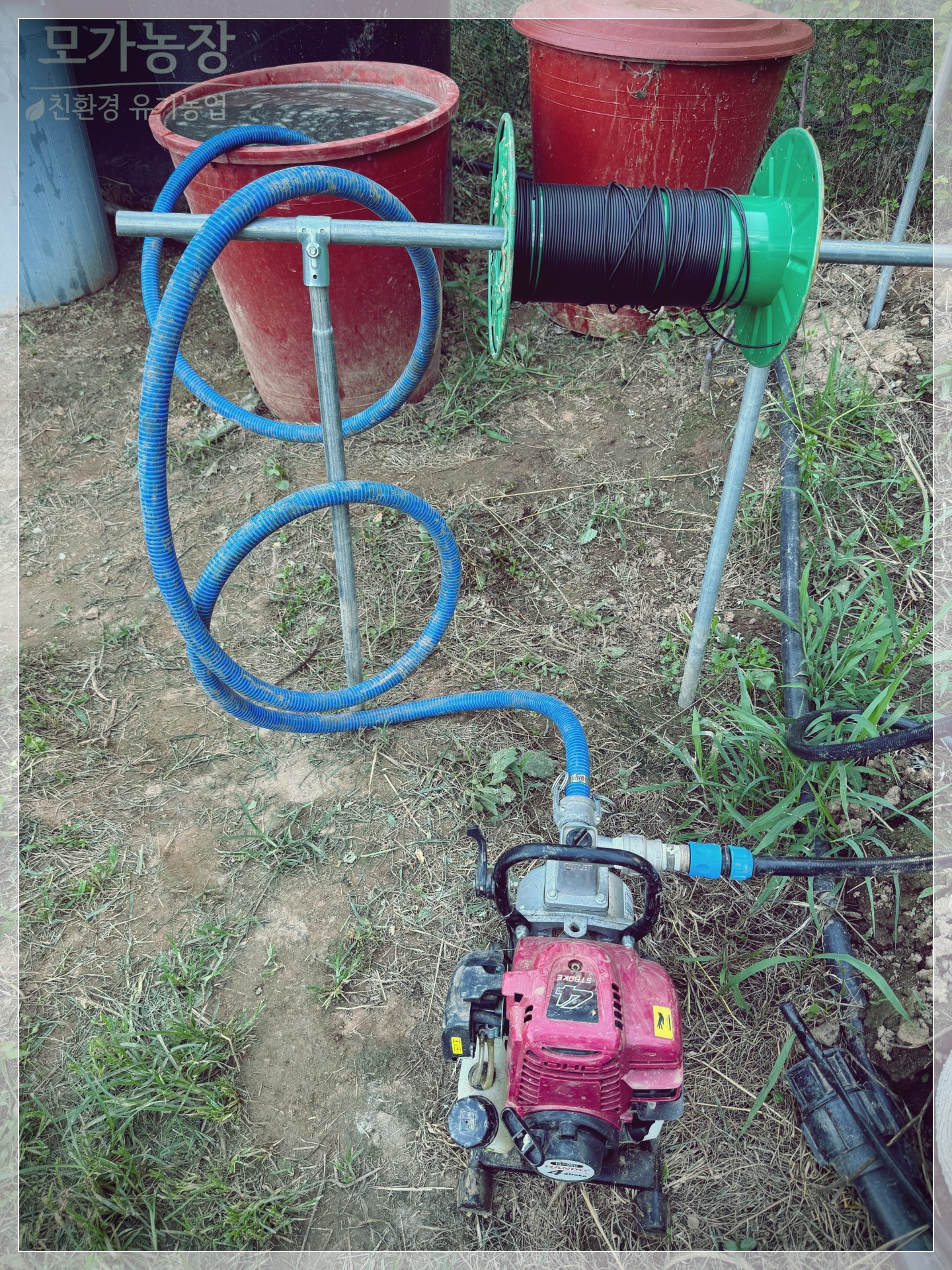 - 1인치 양수기를 이용해 작업동의 1톤 관주용 물탱크로 옮깁니다.