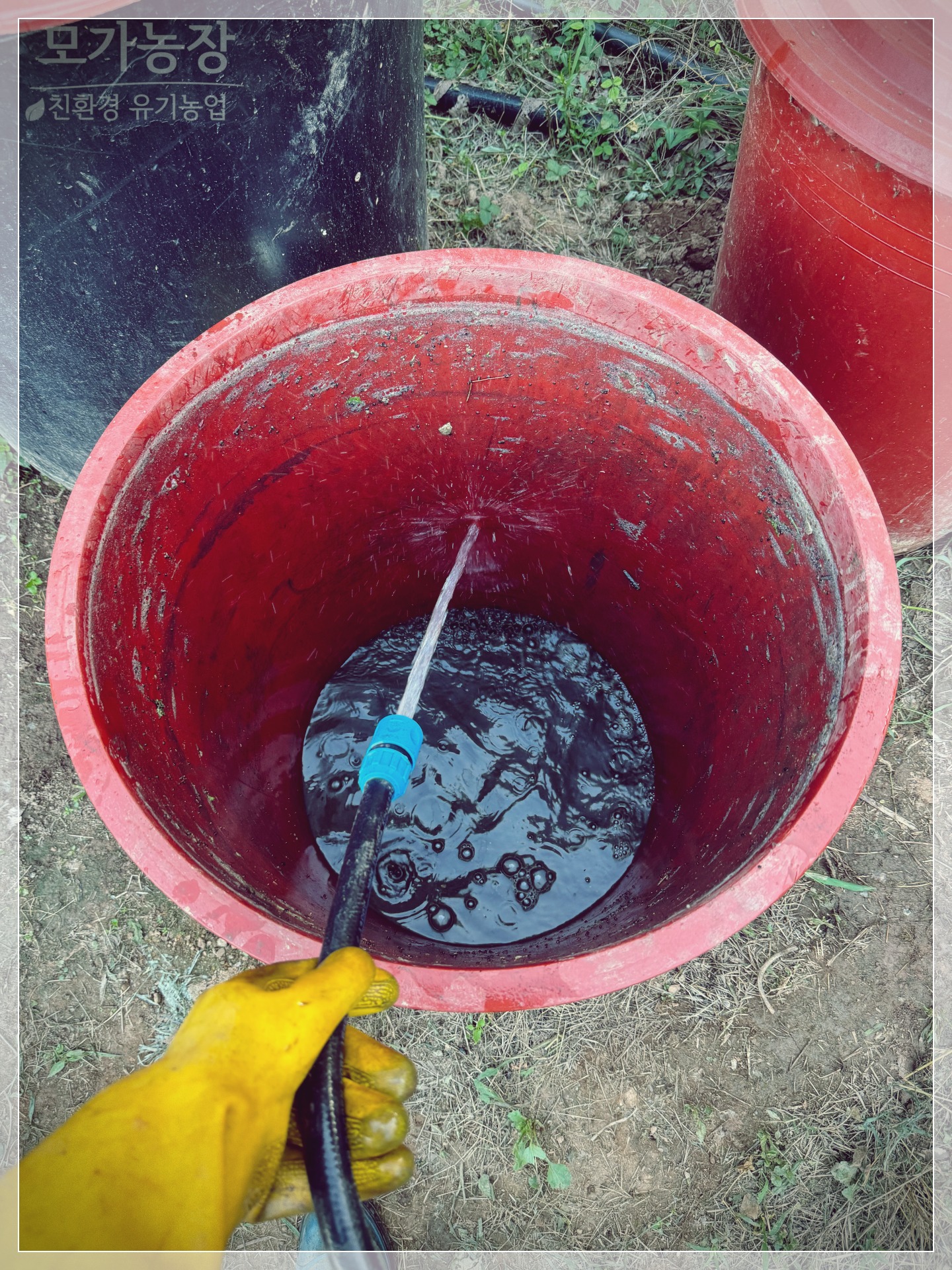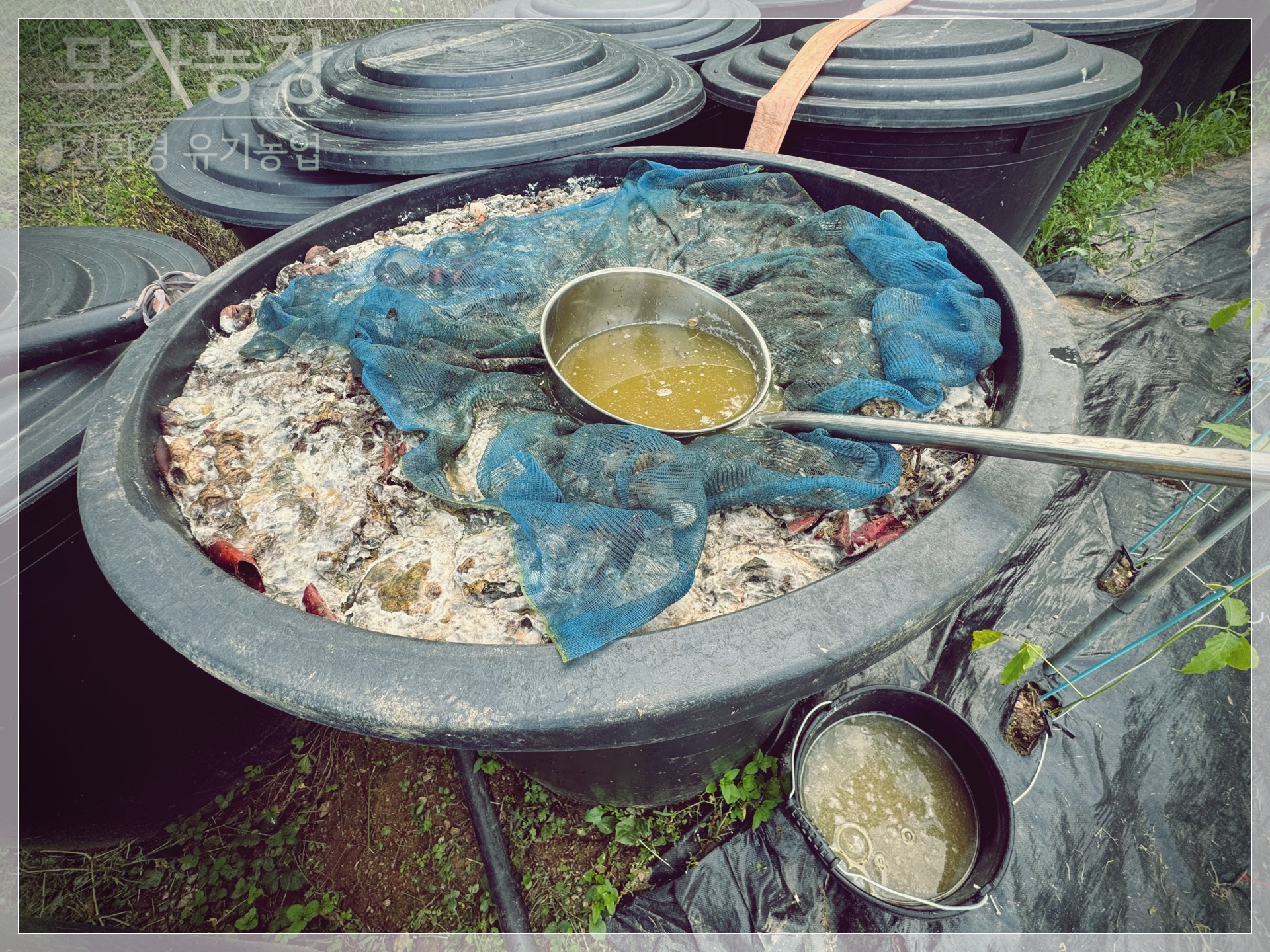- 각 액비에서 1~2 양동이씩 떠서 100L 고무통에 모읍니다.