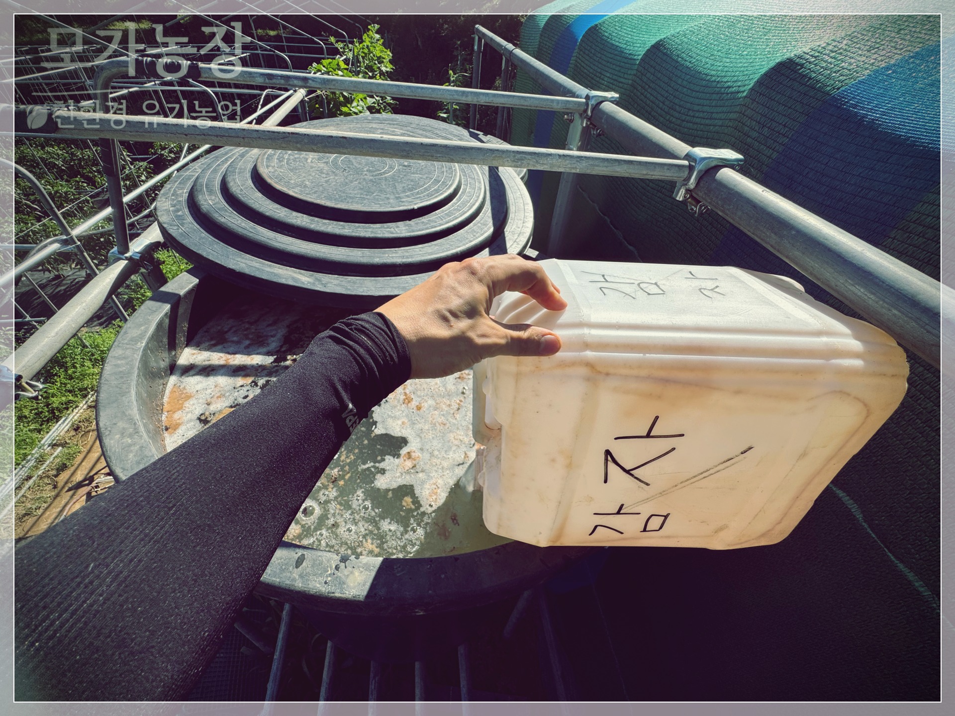 500리터 물을 고무통에 받고, 배양 재료를 희석해 줍니다. 물의 온도가 25~30도 사이에서 대략 하루가 안 되면 배양되는데요. 경우에 따라 조금 더 걸리기도 합니다. 관정에서 바로 받은 물은 차갑기 때문에 조금 더 시간이 걸릴 수 있는데요. 저의 경우 요즘 같은 뜨거운 날씨에도 대략 3일 걸릴 때도 있었습니다. 물을 미리 받아 놓을 경우 바로 다음날에 많이 배양이 이루어진 적도 있습니다.