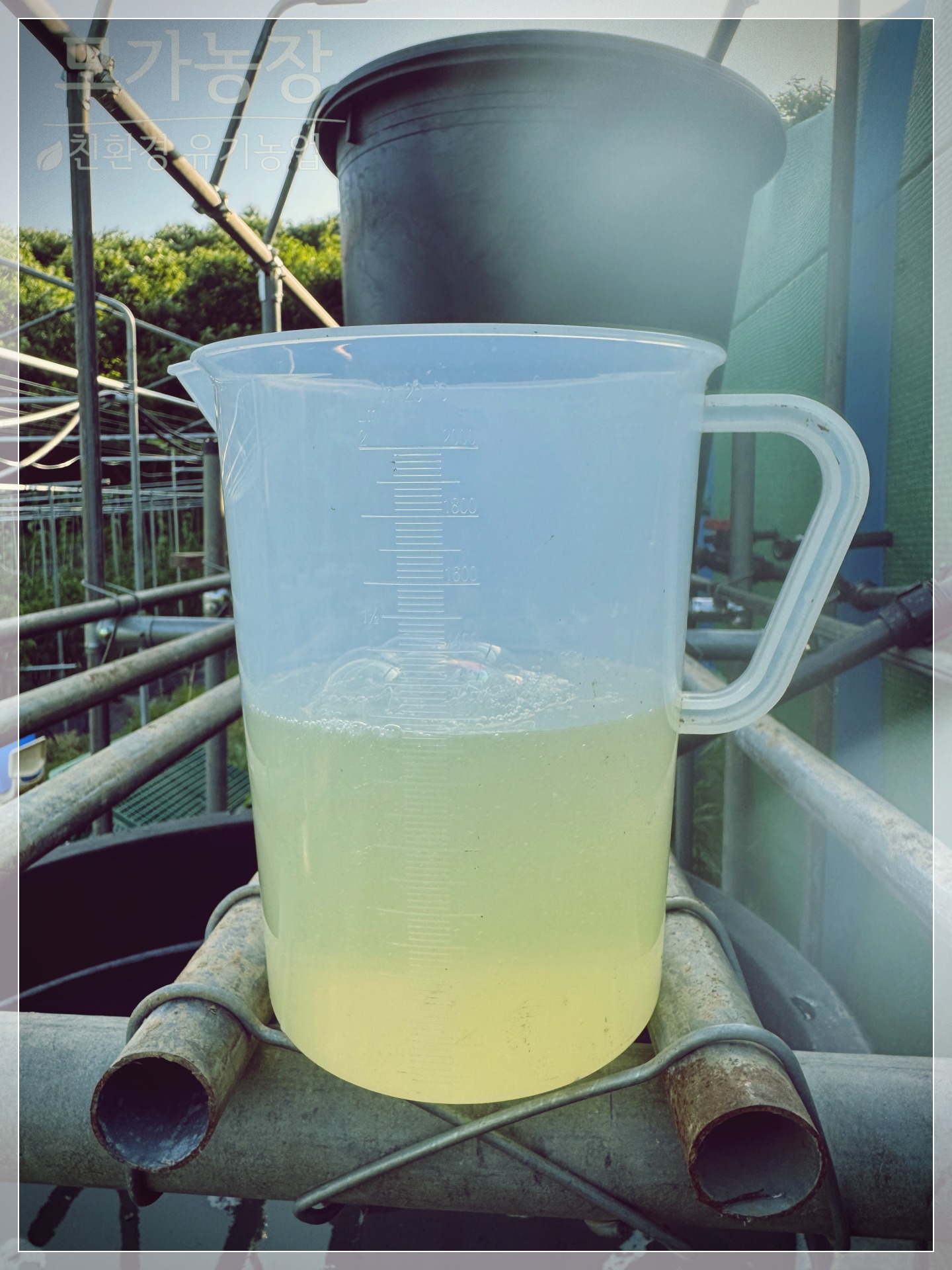 거품이 고무통의 물 표면 위를 가득 메우면 배양이 완료된 것인데요. 거품이 많아야 합니다. 관주용으로 토착 미생물을 배관하던 경험이 있다면, 그보다 두 배를 더 배양해야 하므로 감을 잡을 수 있을 텐데요.